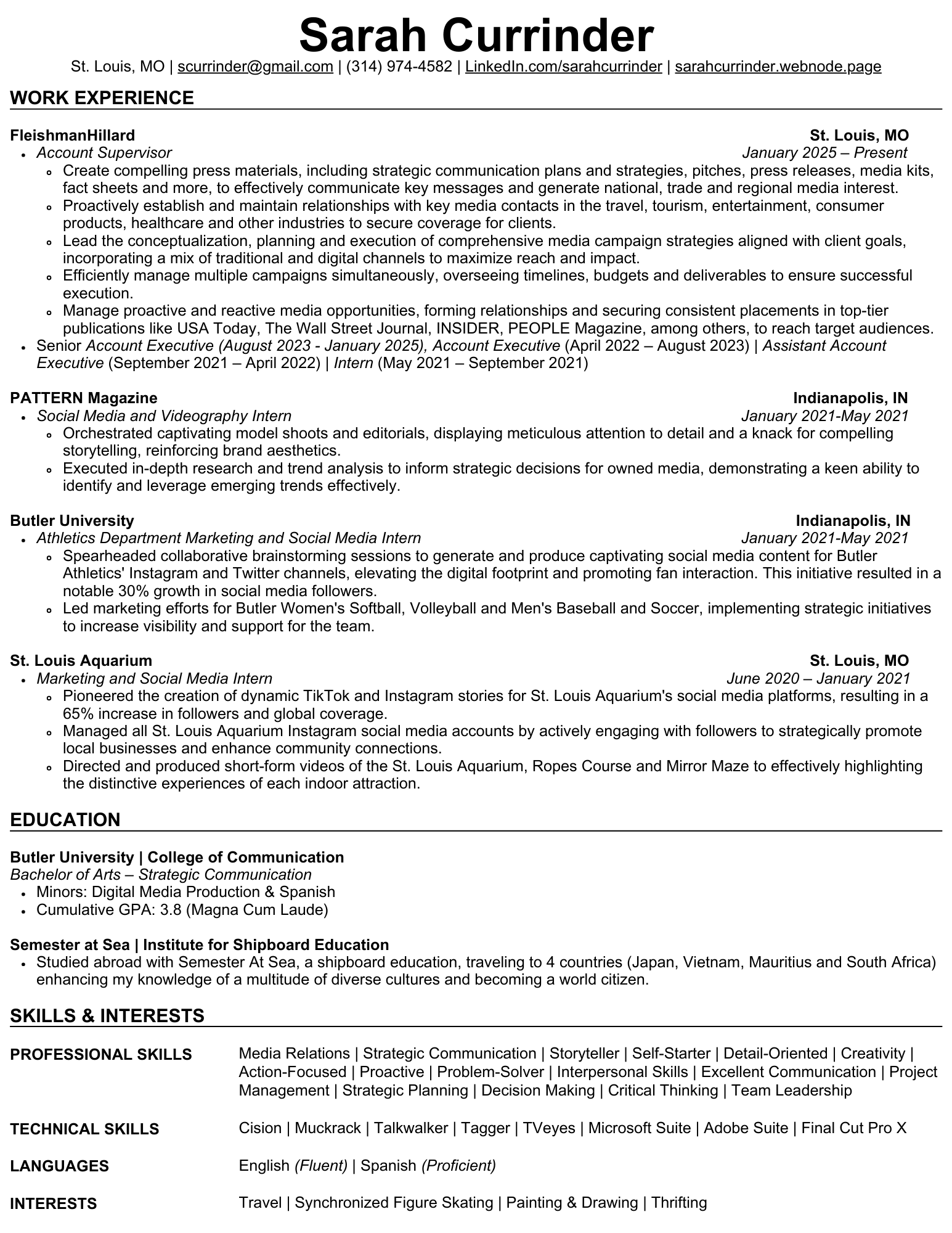 Media Relations | Strategic Communication | Storyteller | Self-Starter | Detail-Oriented | Creativity | Action-Focused | Proactive | Problem-Solver | Interpersonal Skills | Excellent Communication | Project Management | Strategic Planning | Decision Making | Critical Thinking | Team Leadership